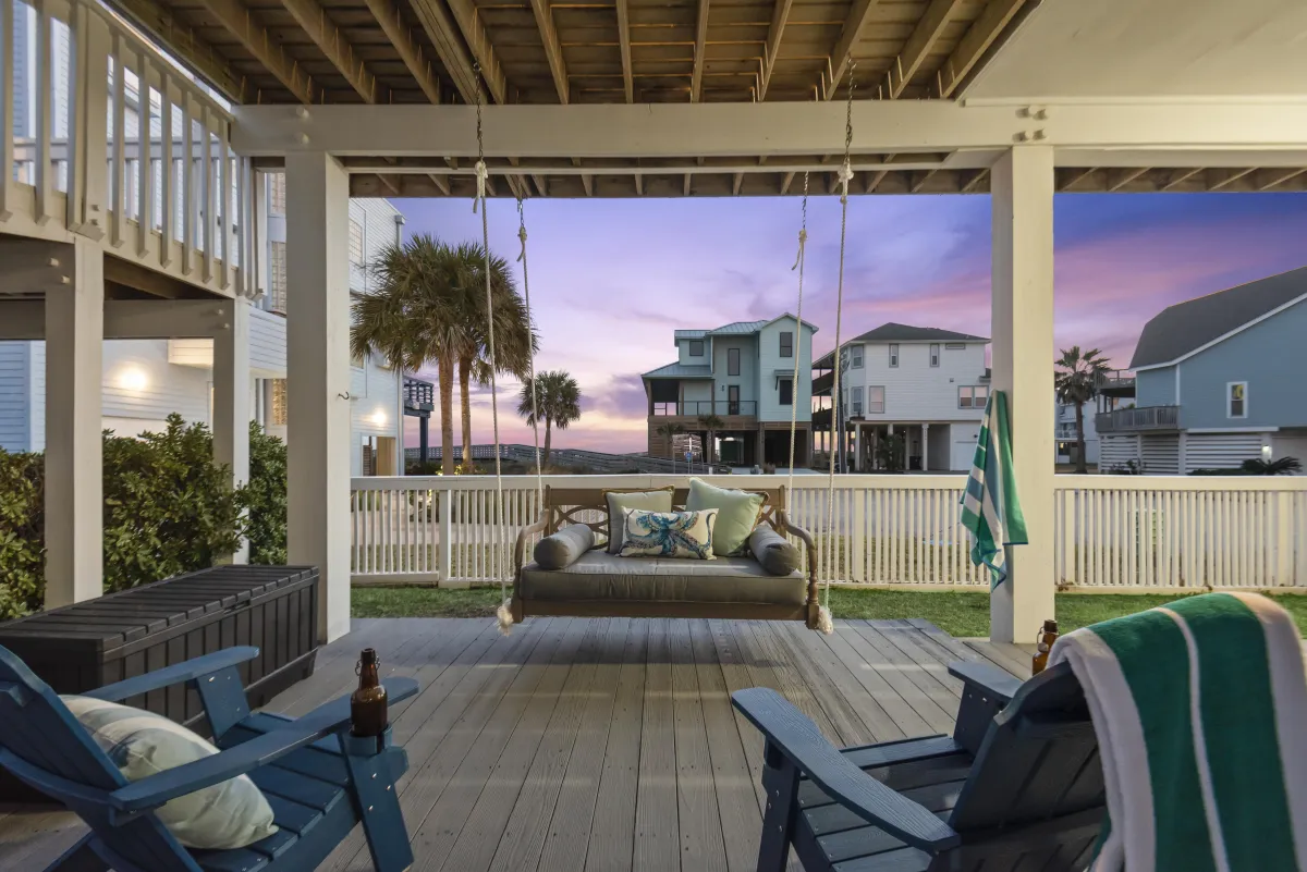 The centerpiece of the property is undoubtedly the wrap-around porch and expansive deck, creating an ideal setting to savor your morning coffee or indulge in al fresco dining with unimpeded ocean views. Immerse yourself in a good book while the rhythmic waves crash upon the sandy shores, offering a soothing soundtrack to your coastal escape. Venture down to one of the most spacious beaches on Galveston Island, free from motorized vehicles, with a full supply of beach chairs, toys, and fun activities. As the cool ocean breeze envelops you, the spacious hot tub with seating up to 7, along with the nearby bench swing, becomes the ultimate haven for relaxation during the tranquil nights. Take advantage of the community pool (open early March through November) to cool down and enjoy some beautiful sunsets. With just a few steps, you find yourself at the doorstep of the ocean, completing the picture of an idyllic beachfront retreat.